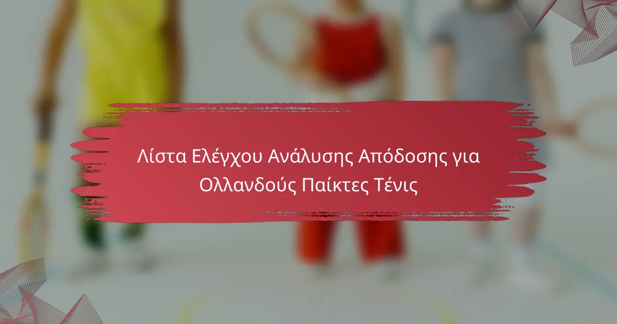 Η λίστα ελέγχου ανάλυσης απόδοσης για τους Ολλανδούς τενίστες περιλαμβάνει μια σειρά από κρίσιμες μετρήσεις, όπως το ποσοστό νικών στους αγώνες, την ακρίβεια του σερβίς και τα επίπεδα φυσικής κατάστασης. Αξιολογώντας τόσο τις τεχνικές δεξιότητες όσο και τους ψυχολογικούς παράγοντες, αυτή η λίστα ελέγχου στοχεύει να παρέχει μια ολιστική εικόνα των ικανοτήτων ενός παίκτη και των τομέων που χρειάζονται ανάπτυξη, ενισχύοντας τελικά την απόδοσή τους στο γήπεδο.